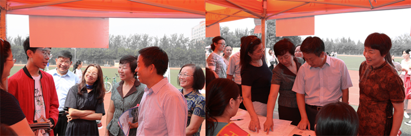 学校领导郭翠芬、盛国军、王淑霞、贺兴利、黄晓彦、侯素美来到新生报到现场,检查指导迎新工作,看望前来报到的新生及家长。每到一处,校领导与新生和家长亲切交谈,对新生表示热烈欢迎,对现场工作人员和大学生志愿者表示亲切慰问。