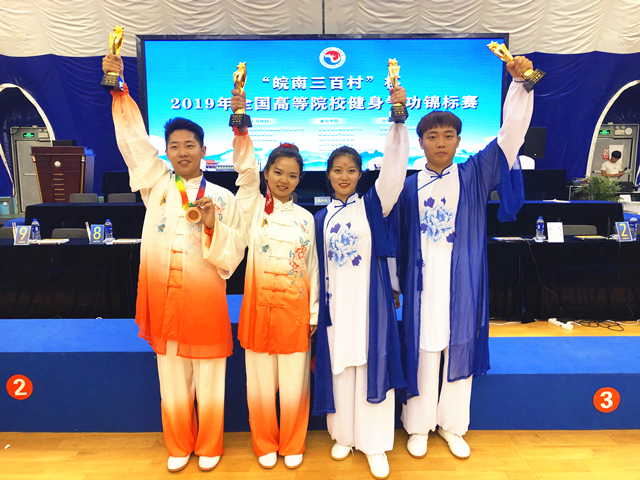 经过激烈的角逐,我校健身气功代表队不负众望,取得两项普通组集体项目二等奖、两项集体项目三等奖。我校旅游学院梁永和获得大舞男子个人项目第三名,工商管理学院徐晓菲获得八段锦女子个人项目第四名,教育学院傅久修获得五禽戏女子个人项目第五名,体育教学部牛继超博士获得五禽戏男子个人项目第七名的好成绩。此外,工商管理学院徐晓菲同学被评为优秀运动员,体育教学部吕梅老师被评为优秀教练员。