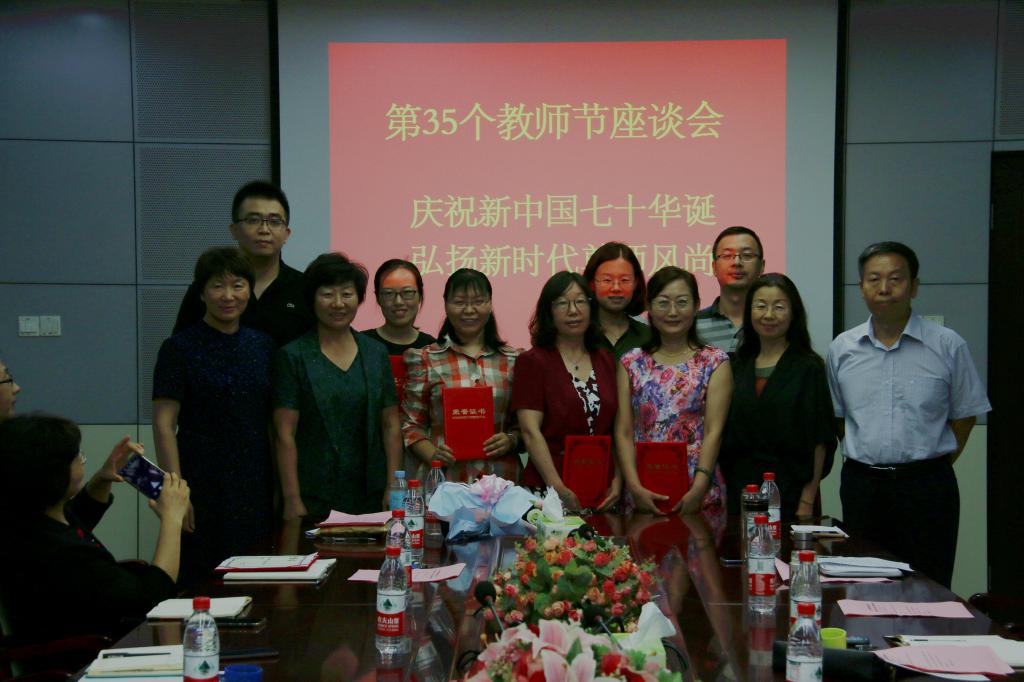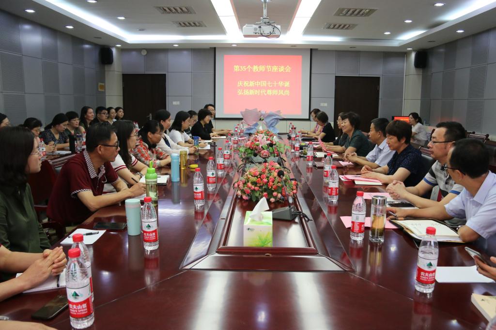 在第35个教师节来临之际,为进一步激励全校教职工增强责任感和使命感,切实营造尊师重教的浓厚氛围,9月10日下午,学校召开庆祝教师节座谈会,表彰从教满30年的教师和学校2019“最美教师”,举行新入职教师宣誓仪式,新老教师围绕“厚植爱国主义情怀、勇担立德树人使命”畅所欲言,共话女院美好未来。学校党委书记郭翠芬、校长盛国军、副校长贺兴利、纪委书记黄晓彦、副校长侯素美出席会议。组织部、宣传(统战)部、人事处、教务处负责人以及从教满30年的教师、学校评选的2019“最美教师”、新老教师代表参加座谈会。会议由郭翠芬主持。