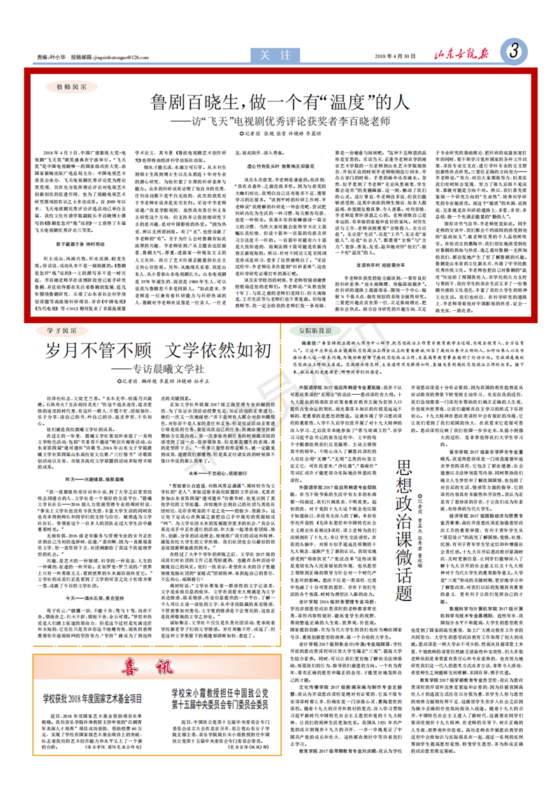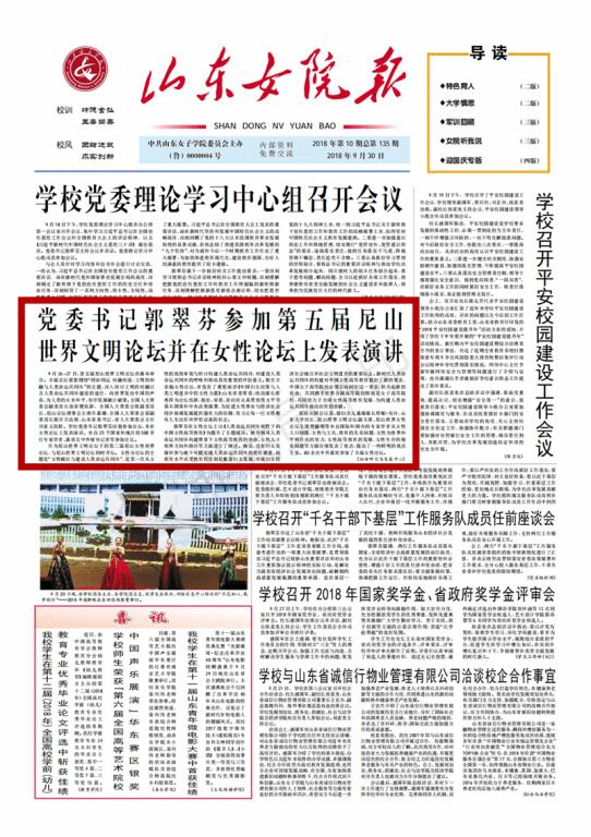 学校校报《山东女院报》(现更名为《今日女院》)的3件作品在2018年度山东省高校校报新闻奖评选中获奖。校报的获奖作品涵盖了消息、通讯、新闻摄影等参评序列。杨荣撰写的《党委书记郭翠芬参加第五届尼山世界文明论坛并在女性论坛上发表演讲》获消息类二等奖,大学生记者团学生张艳等撰写的《鲁剧百晓生,做一个有“温度”的人》获通讯类二等奖,大学生记者团的作品《谱校园华章,迎女院学子》获得新闻摄影类二等奖。