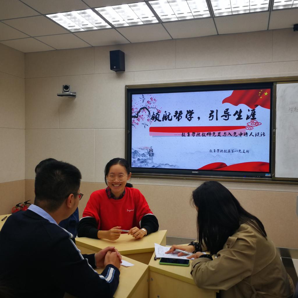 活动中,教师党员与申请入党的同学们开展了热烈的交流讨论。教师党员们深入了解了入党申请人对党的认识、入党动机、对当前时政热点的了解以及今后努力的方向等问题。在党员老师的耐心引导下,申请入党的同学充分地讲述了自己对党、对国家的热爱,表达了想努力成为一名中国共产党员、全心全意为祖国和人民服务的决心。有的同学深情回忆了家中党员长辈的谆谆教诲,激动地热泪盈眶。各位党员老师耐心谈话,向学生们详细阐述了党的性质、宗旨、指导思想、习近平新时代中国特色社会主义思想等基本知识,带领同学们回顾了中国共产党从成立之初到带领中国人民从站起来、富起来到强起来奋斗历程,让同学们深刻感受到中国社会日新月异的变革和党的光辉历程。会议紧凑有序地进行,党员老师们在介绍党史、国史的同时,也解答了同学们入校以来在学习、生活等方面的困惑,鼓励同学从思想上、理论上、品格上、专业上等各方面积极努力,以端正的态度积极向党组织靠拢。