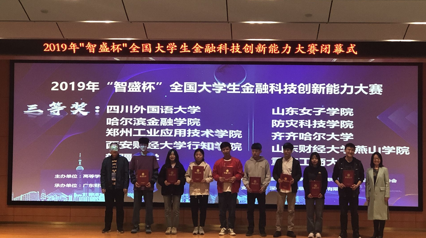2019年“智盛杯”全国大学生金融科技创新能力大赛于12月7日至8日在广东财经大学举办,我校经济学院金融工程专业参赛队在比赛中脱颖而出,荣获国赛三等奖和优秀指导教师奖。