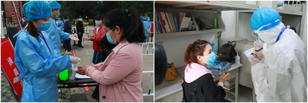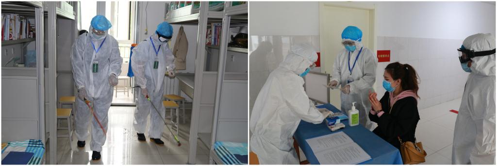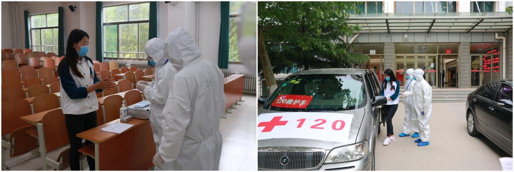 模拟演练内容分为“报到当日学生从西大门进入”“学生在宿舍内晨午检,宿舍通风并做好记录,有序上课”“对未感染新冠病毒发热学生进行留观观察”“由宿舍复测后发热学生转运至发热门诊后,确诊为新型冠状病毒感染病例”“师生进入食堂就餐”“师生进入教室上课,课程进行中一学生自感体温异常,启动应急处置”和“师生进入图书馆阅读,馆内一学生自感不适,复测无异常”7个场景。上午9时整,模拟演练正式开始,参加演练的各小组根据演练方案和操作流程,认真做好入校的体温测量、身份核验、手部消毒等,妥善做好留置观察、登记报告、运送患者、环境消杀等应急处理工作。演练结束后,学校组织了总结反馈会。