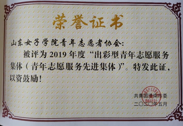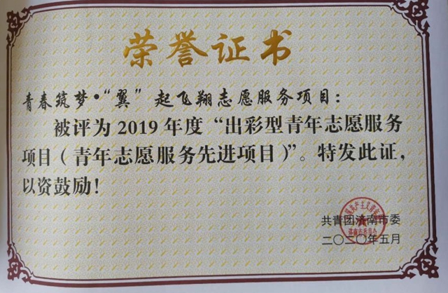 此次评选表彰展现了学校各级共青团组织奋发向上的精神风貌和实干担当的工作状态,也是对学校人才培养水平、共青团工作成效的鼓励和肯定。前期经过学院团总支推荐、校内初评、组织推荐、团济南市委评审,我校经济学院互联网金融专业1601班学生高畅荣获“出彩型团员”称号;外国语学院商务英语专业1701团支部书记安仲雪获“出彩型团干部”称号;青年志愿者协会荣获“出彩型青年志愿服务集体”称号;来自教育学院的青春筑梦·“翼”起飞翔志愿服务、工商管理学院的“暖心向YOUNG”志愿服务和旅游学院的“旅农向阳”志愿服务项目荣获“出彩型青年志愿服务项目”称号。