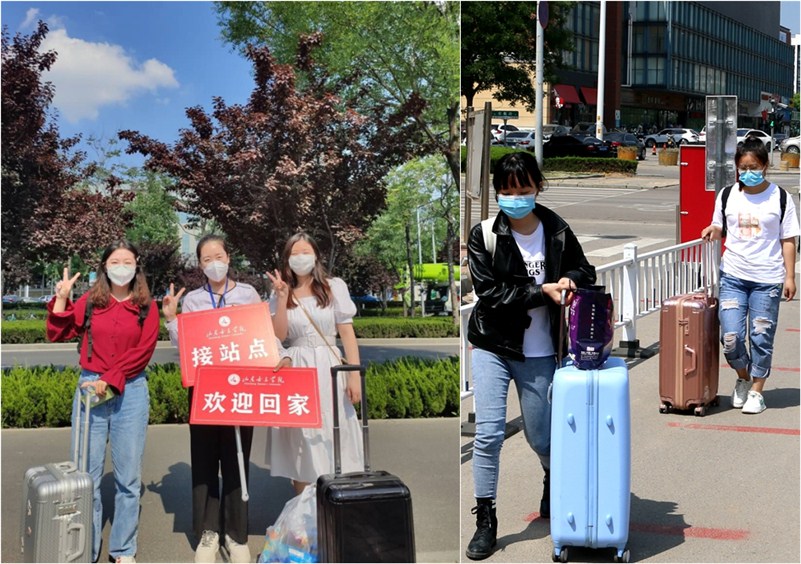 学校在济南遥墙机场、济南火车站、济南高铁西站等设学生返校接待处,专人驻点,设明显接站牌,随车安排老师陪同,“点对点”迎接学生返校,确保每一位学生身体健康和生命安全。辅导员老师向学生送上学校准备的爱心健康包,里面包含防护手册以及口罩、体温计、消毒纸巾等防疫物品,同时还为同学们准备了餐食。