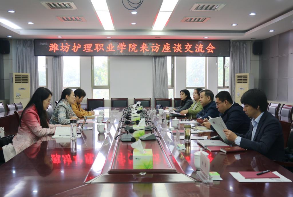 10月15日,潍坊护理职业学院党委书记曹晓楠、健康管理系主任徐玉梅、健康管理系教授王燕一行3人来学校考察交流,学校党委书记郭翠芬、校长盛国军热情接待了曹晓楠一行,教务处、招生就业处、社会与法学院负责人及相关专业教师参加了座谈会。