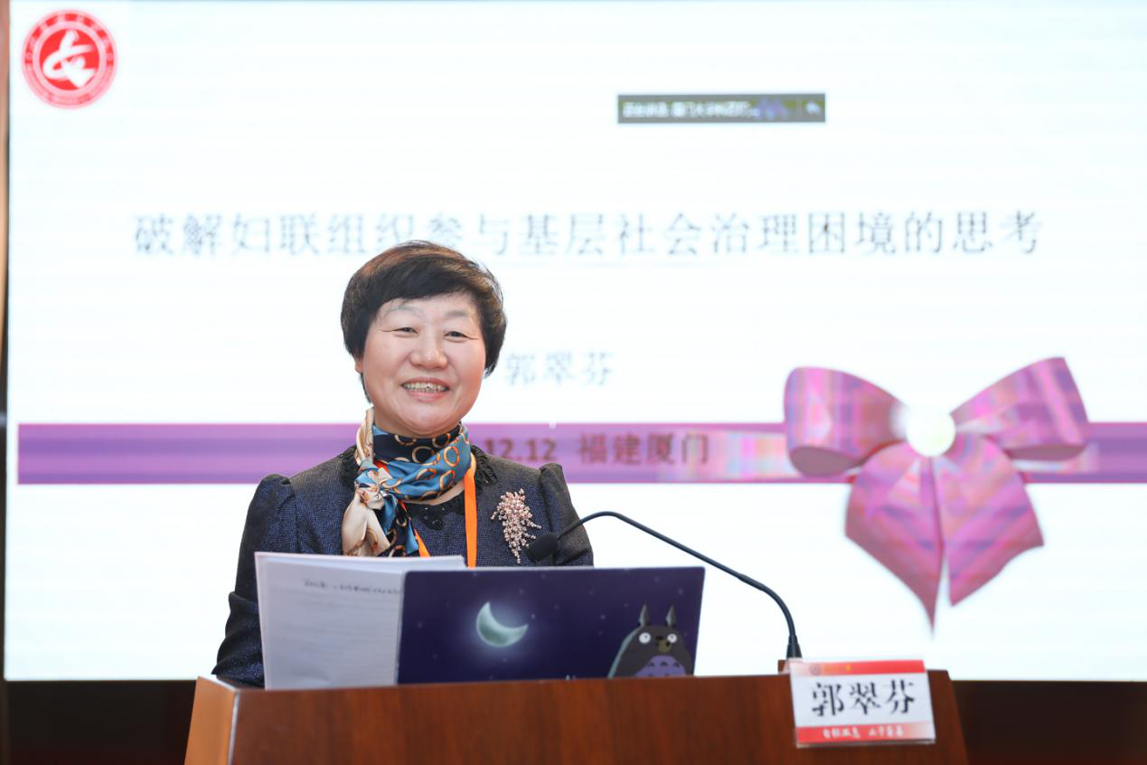 大会主旨发言环节,郭翠芬作“妇联组织参与基层社会治理困境的思考”主题报告。郭翠芬指出,妇联组织深耕基层、广泛联系群众、积极实践,在基层社会治理中发挥着不可替代的作用,为群团组织参与基层社会治理积累了丰富经验。但也存在不少问题和困境,如组织结构薄弱、人员资金匮乏等影响了社会治理作用的发挥。郭翠芬认为,在“多元共治”的社会治理中,政府应转变治理理念,重视妇联组织建设,激活妇联组织发展活力,支持妇联组织依法参与社会治理;应放活政策环境,在“社会协同”上做工作,营造妇联组织改革发展的良好氛围,发挥妇联“联”字作用,将妇联发展成为综合性、枢纽型社会组织;妇联组织要在观念上、行为上和能力上突破路径依赖,提升社会治理能力。