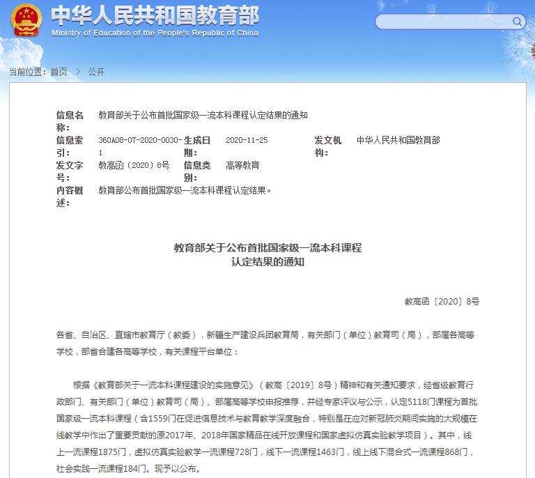 首批国家级一流本科课程共计5118门,包括1875门线上一流课程、868门线上线下混合式一流课程、1463门线下一流课程、728门虚拟仿真实验教学一流课程和184门社会实践一流课程。这是教育部在2018年新时代中国高等学校本科教育工作会议上明确提出“淘汰水课”“打造金课”理念,启动一流本科课程建设“双万计划”以来,国家级五大“金课”首次集体亮相。