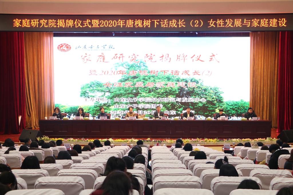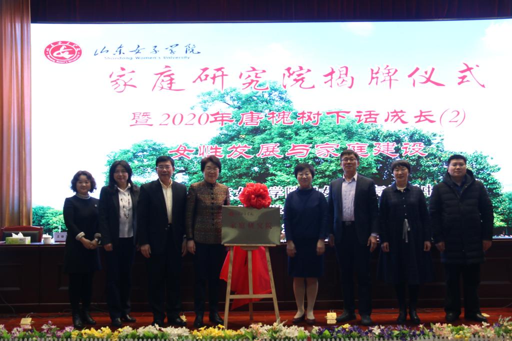 12月20日,学校图书馆二楼报告厅举行家庭研究院揭牌仪式。山东省委宣传部原副部长、山东省文明办原主任刘宝莅,学校党委书记郭翠芬,山东省社科联副主席张宏明,中国妇女研究会副会长叶文振,山东大学法学院教授、博士生导师、山东省妇联兼职副主席王丽萍,学校副院长侯素美,厦门大学妇女/性别研究与培训基地副主任、博士生导师石红梅教授,山东省青少年教育科学研究院院长裴云峰出席揭牌仪式并在主席台就座。兄弟高校、科研院所的专家学者以及发展规划处、科研处、妇女研究与发展中心负责人和师生代表200余人参加揭牌仪式。揭牌仪式由副院长侯素美主持。
