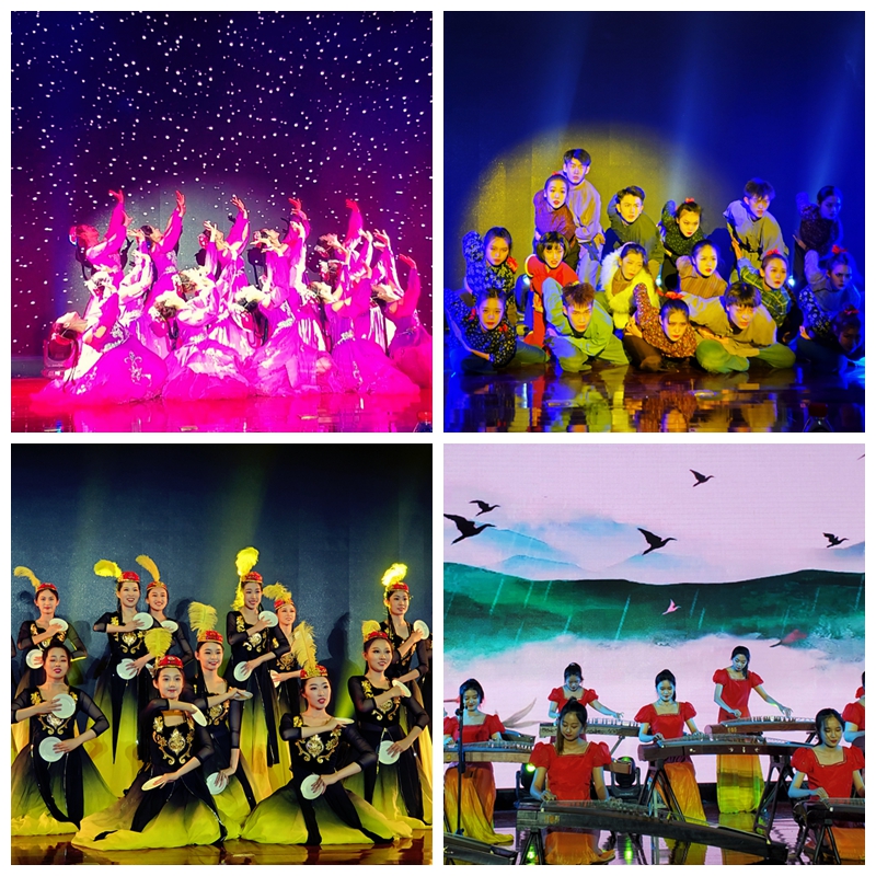 演出在新打击乐《校园节拍》《舞蹈表演综合展示》中拉开帷幕,同学们用欢快的节奏鼓点、灵巧的动作、扎实的基本功展现出青年人的朝气蓬勃、昂扬向上的姿态,快板《梦想腾飞在女院》以传统艺术形式呈现了女院莘莘学子的梦想。情景表演唱《新绣荷包》、男生表演唱《运河号子》、男声独唱《爱永在》、古筝合奏《浏阳河》、古典群舞《醉春风》、维族群舞《晨曦中的玫瑰》通过独具地方色彩、浓郁的民族气息的歌舞展现生动展示祖国大好河山及各民族人民爱党、爱国之情。当代舞《最后的名单》、原创民族民间舞《根语》、当代舞《八女投江》用舞蹈表达了对英雄的缅怀和敬意。十三个节目既主题统一又兼具特色,充分展示了女院学子昂扬向上的精神风貌。