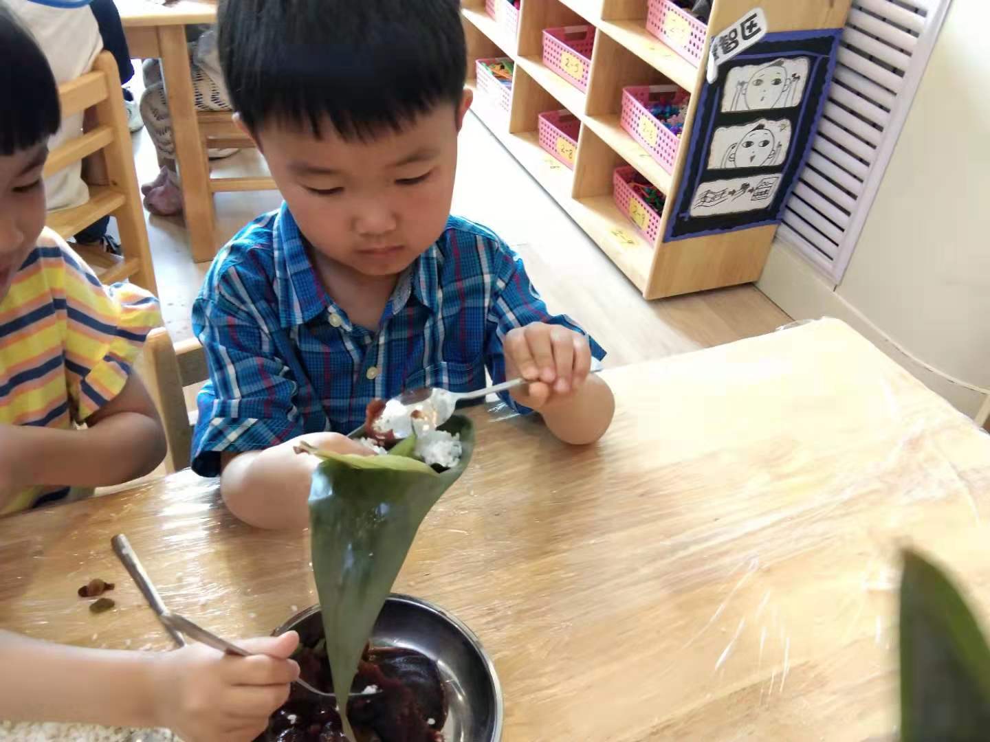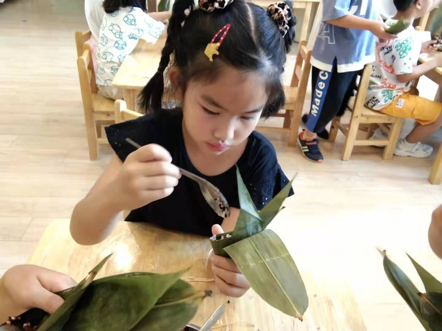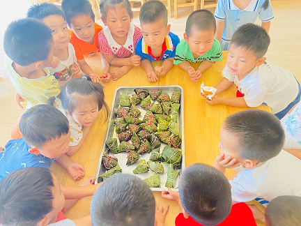 在老师的指导下,孩子们自己动手学包粽子,既品尝到了劳动的喜悦,又把自己包好的粽子分享给老师和家人,体会到分享的快乐。