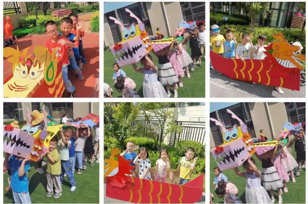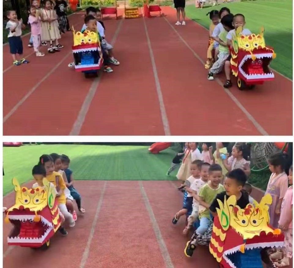 为了让孩子们亲身体验端午节的习俗,幼儿园举行了别出心裁的龙舟比赛和舞龙表演。