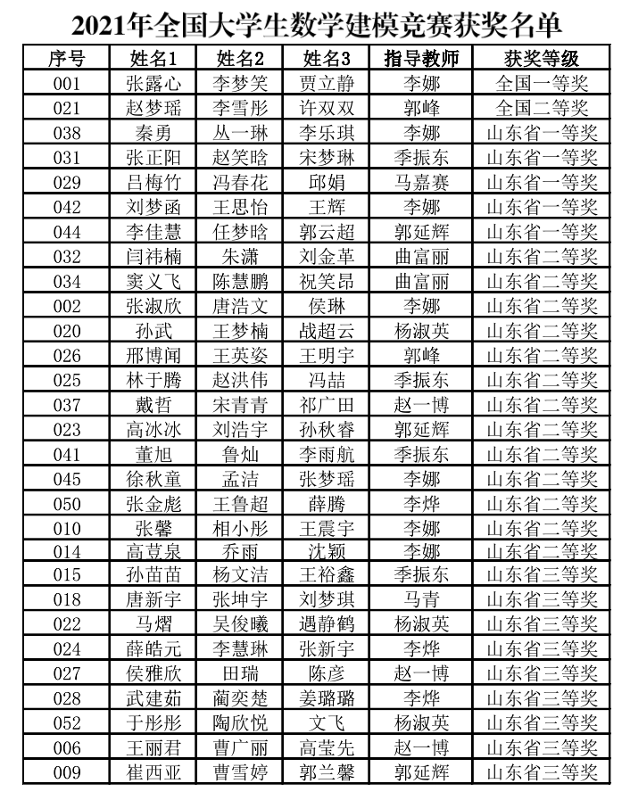 近日,由教育部高教司、中国工业与应用数学学会主办的2021年高教社杯全国大学生数学建模竞赛成绩揭晓。我校代表队获得全国一等奖1项、二等奖1项,山东省一等奖5项、二等奖13项、三等奖9项的好成绩。