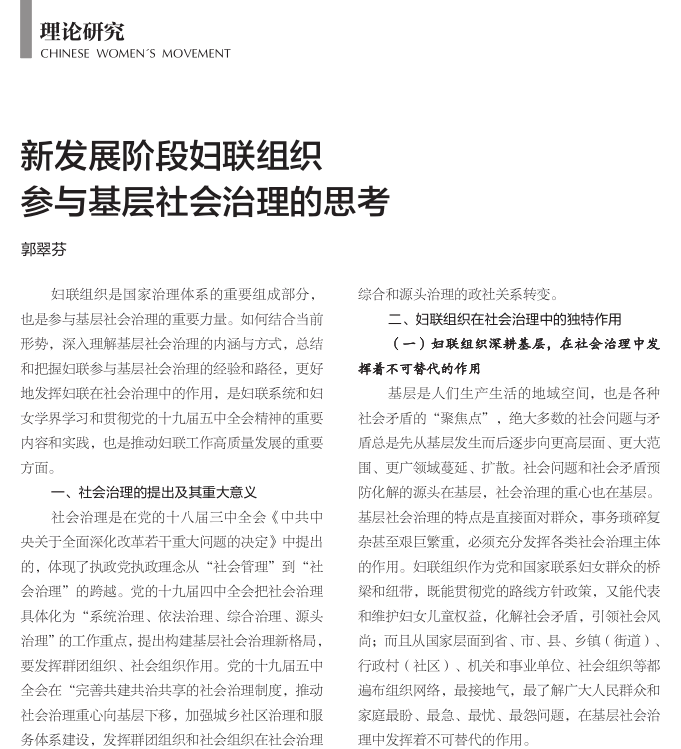 文章指出,基层社会治理是我国“十四五”规划发展时期一项重要任务,妇联作为党领导下联系妇女群体的组织,是基层社会治理的重要协同力量。妇联组织深耕基层,有效整合社会资源,积极融入基层社会治理,有利于推动政府职能转变,弥补政府公共服务和社会治理的不足,推动中国特色社会治理体系建设。