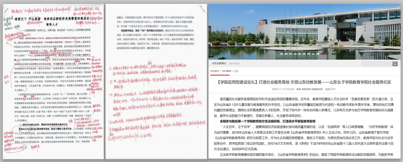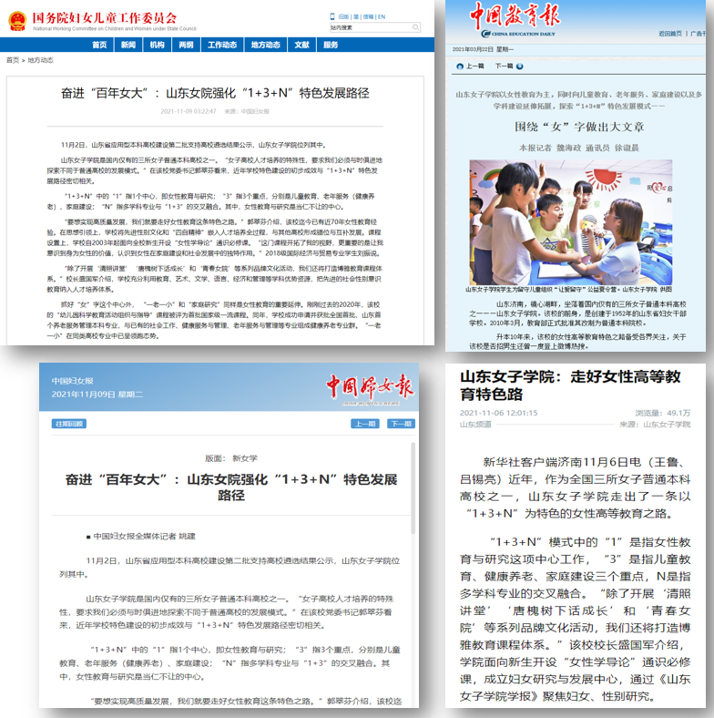 继2020年末,在驻济高校中首家对接山东省教育厅与大众日报联合发起“高质量发展看山东·高校行”大型采访活动后,2021年初,党委宣传部以“学院应用型建设巡礼”为题,策划推出了一组有深度的宣传报道,一组报道,近10篇稿件,每一篇都需要经过和各学院的十数次乃至数十次的共同研究打磨,“表达不清楚是源于没有想清楚”,不能用文字表达清楚自身建设特色,说明对这个问题的思考还不够深入成熟,经过反复沟通修改,随着各篇报道依次呈现,应用型建设的特色和路径也如拨云见日,逐渐清晰起来,同时吸引了更多媒体的报道,权威媒体的“背书”往往在各类高层次项目申报中发挥着不可替代的助力作用,越来越多的学院开始习惯主动提炼人才培养、科学研究、社会服务等方面的特色。供给创造需求、需求牵引供给的良性互动初见端倪。量变孕育着质变,2021年3月,《山东女子学院探索“1+3+N”特色发展模式——围绕“女”字做出大文章》在《中国教育报》发表,“山东教育发布”“中国教育发布”跟进转载。