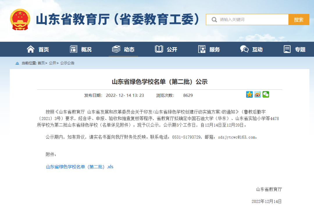 12月14日,山东省教育厅、山东省发展和改革委员会公示了山东省绿色学校名单,学校入选第二批“山东省绿色学校”。