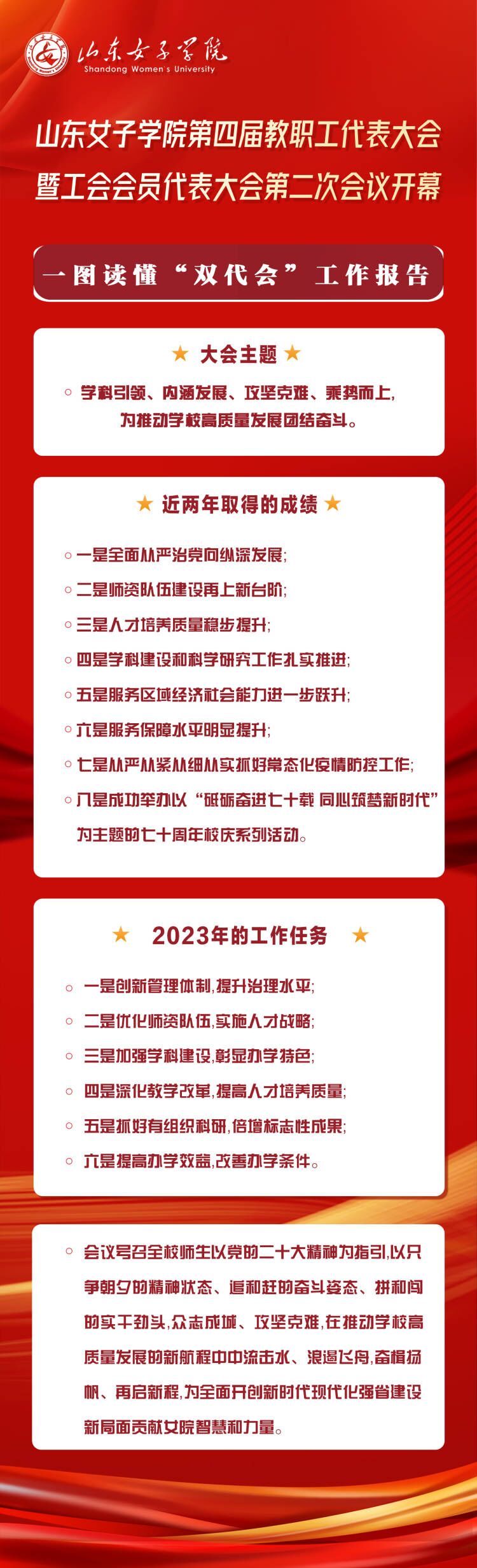 学校党委副书记、校长李光红作工作报告。报告从八个方面回顾总结了学校近两年取得的成绩:一是全面从严治党向纵深发展;二是师资队伍建设再上新台阶;三是人才培养质量稳步提升;四是学科建设和科学研究工作扎实推进;五是服务区域经济社会能力进一步跃升;六是服务保障水平明显提升;七是从严从紧从细从实抓好常态化疫情防控工作;八是成功举办以“砥砺奋进七十载 同心筑梦新时代”为主题的七十周年校庆系列活动。2023年是贯彻党的二十大精神的开局之年,也是深入实施“十四五”事业发展规划承上启下的关键之年,更是深入推进应用型本科高校建设的重要之年,报告明确了2023年学校工作的总体要求,从6个方面、8项任务、15条工作举措对2023年的重点工作任务进行部署:一是创新管理体制,提升治理水平;二是优化师资队伍,实施人才战略;三是加强学科建设,彰显办学特色;四是深化教学改革,提高人才培养质量;五是抓好有组织科研,倍增标志性成果;六是提高办学效益,改善办学条件。号召全校师生以党的二十大精神为指引,以只争朝夕的精神状态、追和赶的奋斗姿态、拼和闯的实干劲头,众志成城、攻坚克难,在推动学校高质量发展的新航程中中流击水、浪遏飞舟,奋楫扬帆、再启新程,为全面开创新时代现代化强省建设新局面贡献女院智慧和力量。