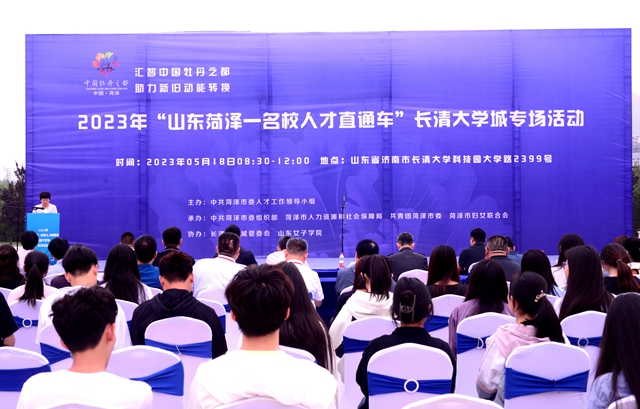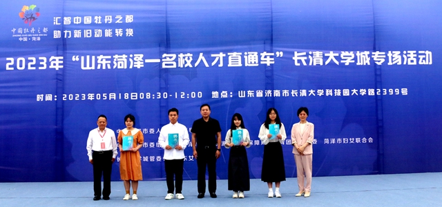 为贯彻落实党中央、国务院“稳就业”“保就业”决策部署及省委组织部、省人力资源和社会保障厅关于“全链条引才、推动青年人才集聚”的工作要求,5月18日上午,“山东菏泽—名校人才直通车”长清大学城专场招聘会在学校巾帼广场举行。副校长刘恩允,菏泽市人力资源和社会保障局党组成员、市返乡创业服务中心主任李迁,共青团菏泽市委书记林永敬、长清大学城管委会副主任陈晓勇以及山东师范大学、山东中医药大学、山东齐鲁工业大学(山东省科学院)等9所高校就业负责人参加了活动启动仪式。启动仪式由菏泽市妇联党组成员、副主席李荷玲同志主持。