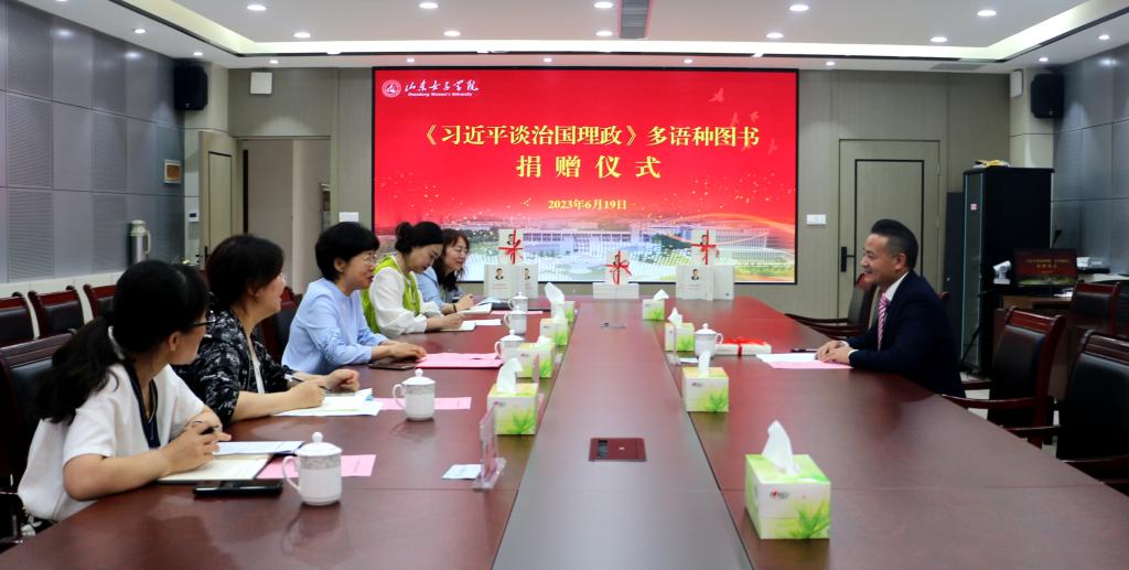 吕晓黎代表学校向慷慨捐赠图书、助力学校教育事业发展的北京崇学文化发展有限公司表示感谢。她指出,受赠图书进一步丰富了学校图书馆馆藏文献资源,具有很高的收藏价值和使用价值,将成为学校进一步加强思想政治工作的教材,也将成为外语学习和中外语言文化学习的好读本,对于进一步厚植爱国情怀、提高人才培养质量将发挥重要作用。吕晓黎要求广大师生要深入学习《习近平谈治国理政》,切实用习近平新时代中国特色社会主义思想武装头脑、指导实践、推动工作,为学校高质量发展和建设特色鲜明的高水平应用型女子大学而不懈努力!