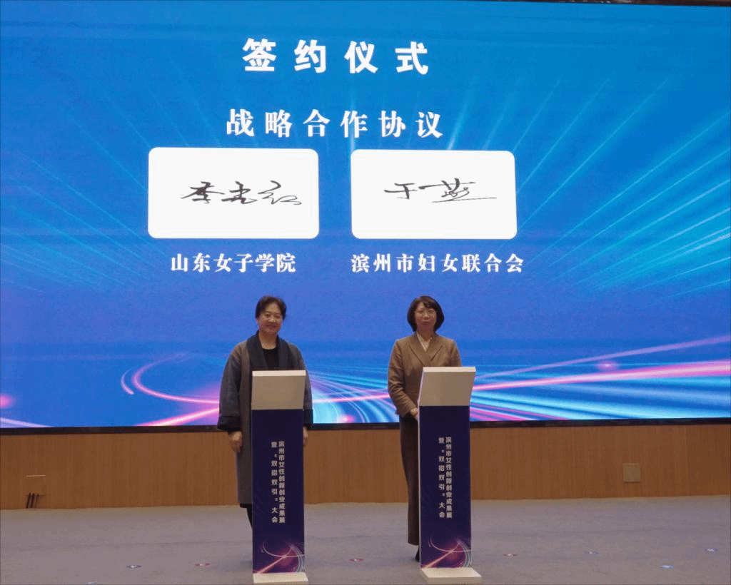 现场举行了校地战略合作签约仪式。李光红校长与滨州市妇联党组书记、主席于燕签署战略合作协议。