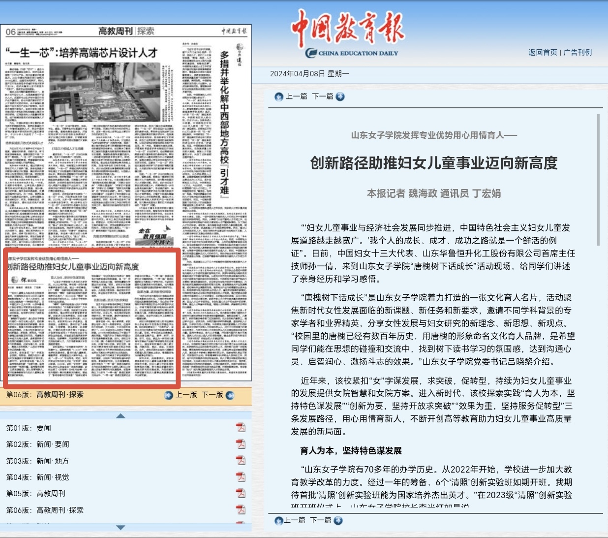 4月8日,《中国教育报》刊发《山东女子学院发挥专业优势用心用情育人——创新路径助推妇女儿童事业迈向新高度》,聚焦学校助推妇女儿童事业高质量发展工作典型经验。