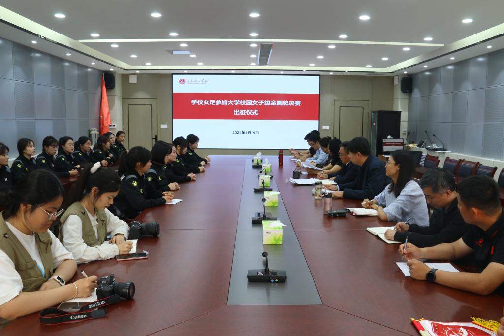 4月19日下午,学校举行女足参加全国大学女子校园组总决赛出征仪式。学校党委副书记龙希利出席出征仪式,学校女足队员、教练员、跟队学生记者、党委宣传部、体育教学部、学生处、团委负责人参加活动。