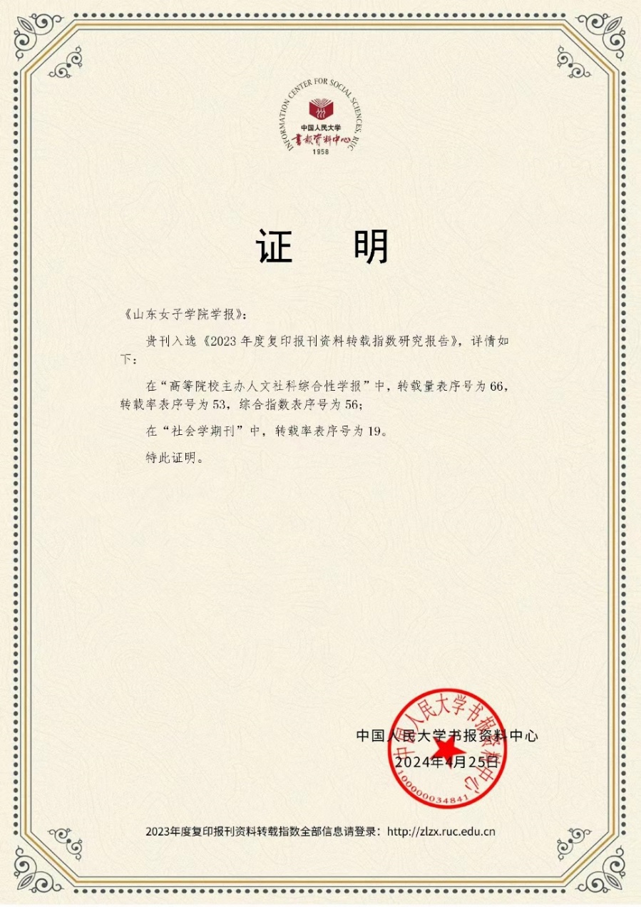 在进入“高等院校主办综合性学报”转载名录的100种期刊中,《山东女子学院学报》转载量排第66位,转载率排第53位,综合指数排第56位;在进入“社会学期刊”转载名录的20种期刊中,《山东女子学院学报》的转载率排第19位。