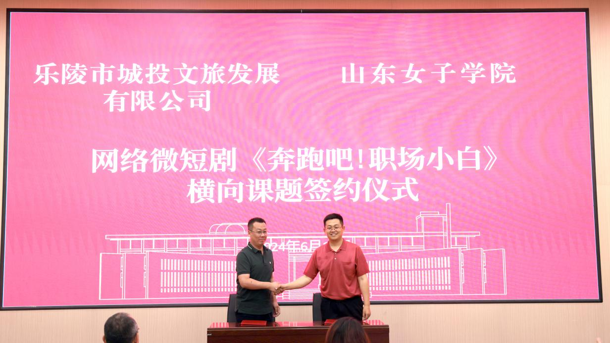 传媒学院院长李百晓对网络微短剧《奔跑吧!职场小白》进行了项目介绍,并围绕学院学科专业发展、人才培养以及社会服务等方面内容进行主题发言。随后,杨旭光、李百晓代表双方就网络微短剧《奔跑吧!职场小白》横向课题项目签约。