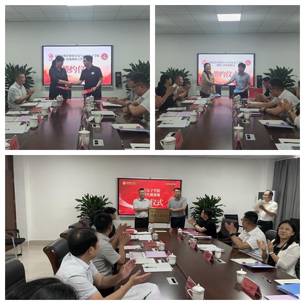 会上,教育学院副院长王飞与张彩梅,继续教育学院院长陈珂与王亚平代表双方在协议书上签字。招生就业处处长吕慎敏代表学校向高唐第三中学授牌“山东女子学院优质生源基地”。