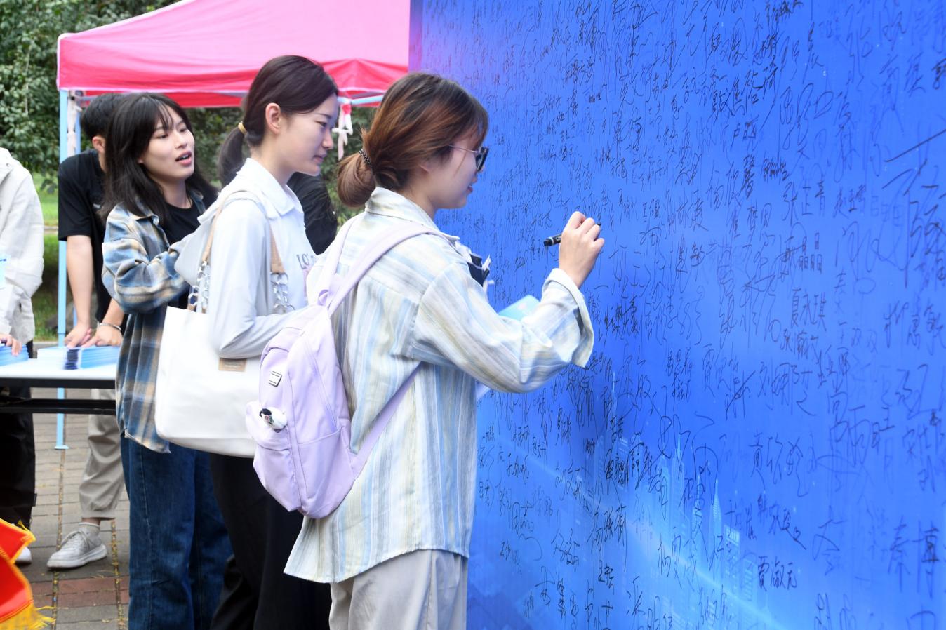 在教学区、生活区张贴海报、悬挂横幅、利用电子屏幕展示宣传口号,利用校内媒体推送网络安全法律法规、安全用网知识和防护技能,营造“共筑网络安全防线、同守网络清朗空间”的良好氛围。在教学区组织校园日现场活动,向师生发放网络安全知识宣传学习手册,提供现场技术支持,解答网络安全、校园网使用等方面的问题,并组织现场签名。活动现场共发放各类宣传资料1200余份,正在军训的新生也在休整间隙参加活动,为构筑网络安全第一道防线奠定了基础。