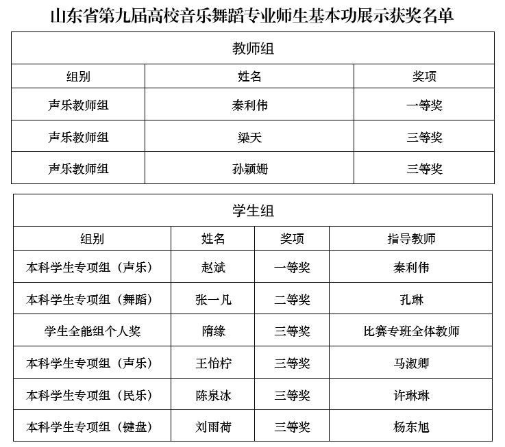 10月8至13日,由山东省教育厅主办的山东省第九届高校音乐舞蹈专业师生基本功展示在淄博举办。音乐学院师生积极备赛,选派3位教师和8位学生参加声乐、舞蹈、民乐、键盘等多组别的展示,荣获一等奖2项、二等奖1项、三等奖6项,其中秦利伟老师以97.76分的成绩获得声乐教师组现场比赛第一名,得到专家同行的一致好评。