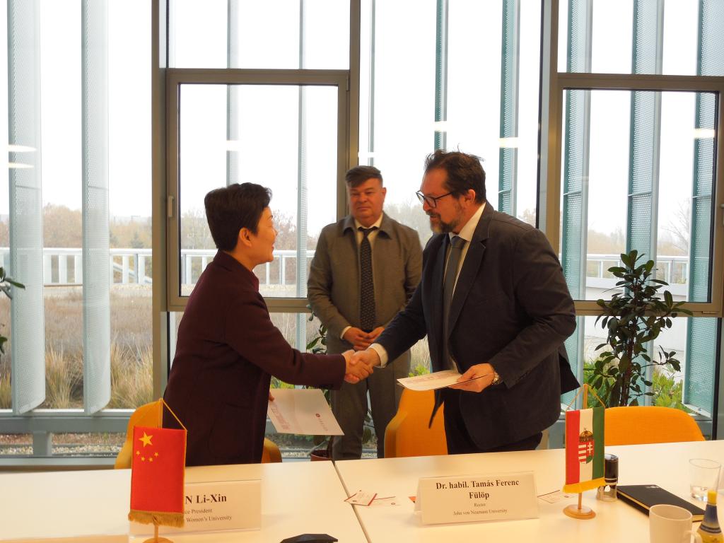 在纽曼·亚诺什⼤学,访问团与该校主席Dr. Tamás Fülöp、校长Dr. Zoltán Nagy,副校长Dr. Norberta Sági等进行了座谈交流。田立新首先转达了学校党委书记对一同参加第十一届“世界大学女校长论坛”的Norberta Sage副校长的亲切问候,随后介绍了学校学科专业建设、人才培养模式等方面的情况。在前期充分交流的基础上,双方签署了合作谅解备忘录,就教师交流、学生留学、合作研究、文化交流等方面开展合作达成初步意向。