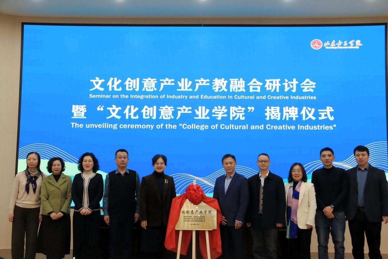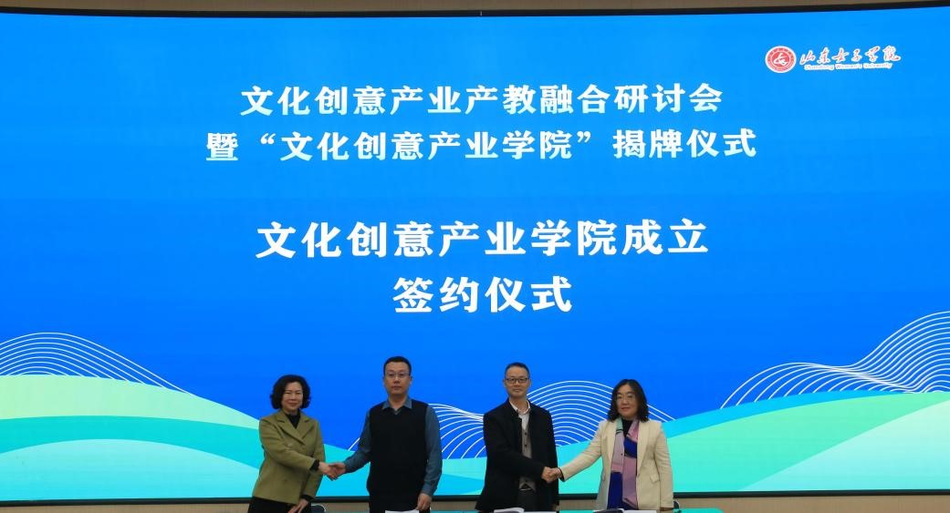 12月20日,学校文化创意产业产教融合研讨会暨“文化创意产业学院”成立揭牌仪式在求真楼报告厅举行。济南市文化和旅游局二级巡视员郭象峥、产业发展处副处长宋珂,山东省行为科学学会会长黄少英、副会长张振勇,乐陵市城投文旅发展有限公司董事长杨旭光,山东师创信息科技集团有限公司总裁助理魏秋军,学校党委副书记、校长李光红,副校长刘恩允出席活动,学校教务处、合作发展处、艺术设计学院等单位负责人参加活动。活动由刘恩允主持。