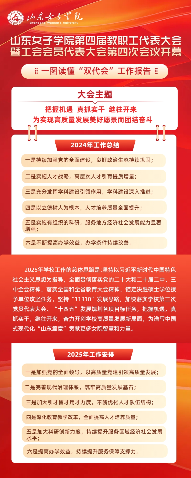与会代表听取了《工会工作报告》《财务工作报告》《提案工作报告》。《工会工作报告》从强化政治引领、加强民主管理、优化服务品质、创新活动形式、严格收支管理五个方面总结了2024年工会工作;从扛牢政治责任、服务中心大局、做实暖心关爱、履行建设职能四个方面提出了2025年工作的思路和展望。《财务工作报告》总结了2024年的财务工作,分析了学校财务收支决算情况,报告了2025年度资金预算和重点工作安排。《提案工作报告》总结了四届三次“双代会”提案落实情况和四届四次“双代会”提案征集情况。