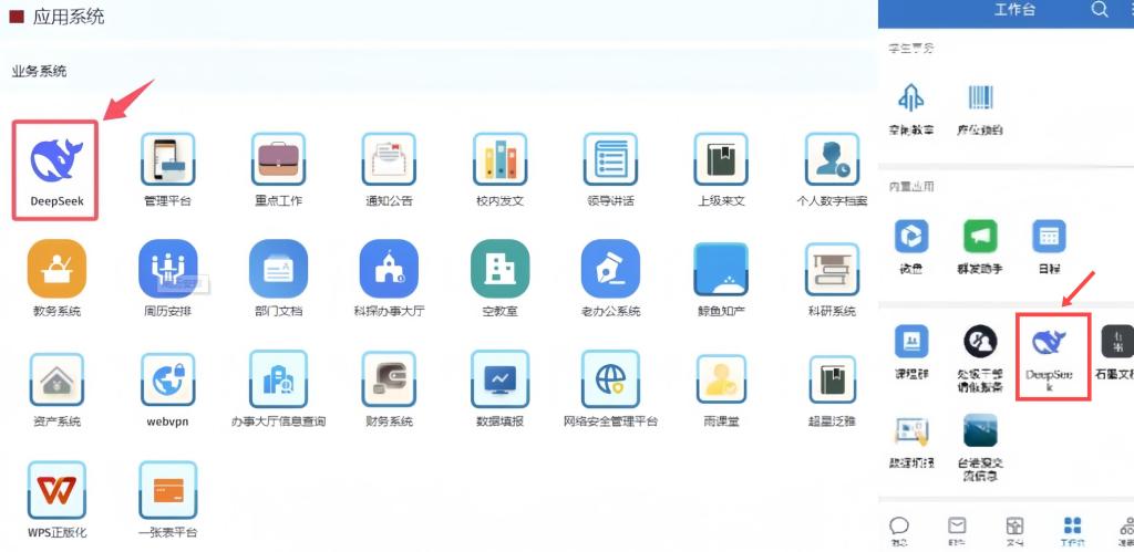 学校DeepSeek平台依托中国移动济南数据中心的强大的算力资源,采用混合云的模式,成功搭载了DeepSeek-R1蒸馏版AI大模型,为全校师生提供安全、稳定、高效的校内AI解决方案,打造面向学校教育教学的智能化服务生态。该平台可通过办公系统的“应用系统”栏目或“企业微信”APP工作台进入使用。