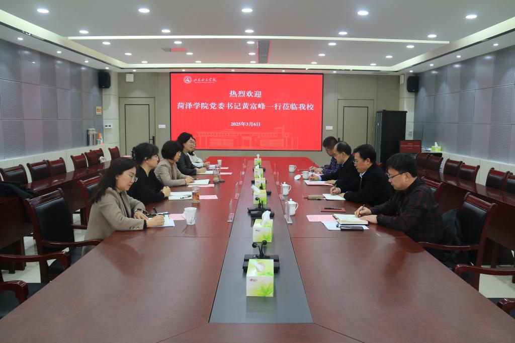 黄富峰对学校的热情接待表示感谢,对学校取得的办学成果给予高度评价,并介绍了菏泽学院的办学历史、特色优势。他表示两校拥有深厚感情,希望两校继续深化友谊,进一步加强交流合作、共享经验、优势互补,在务实交流中共同实现高质量发展。