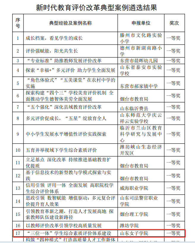 近日,山东省教育评价学会官网公布了山东省新时代教育评价改革典型案例遴选结果,学校申报的《“三位一体”学生综合素质评价体系建设》案例成功入选并荣获一等奖。