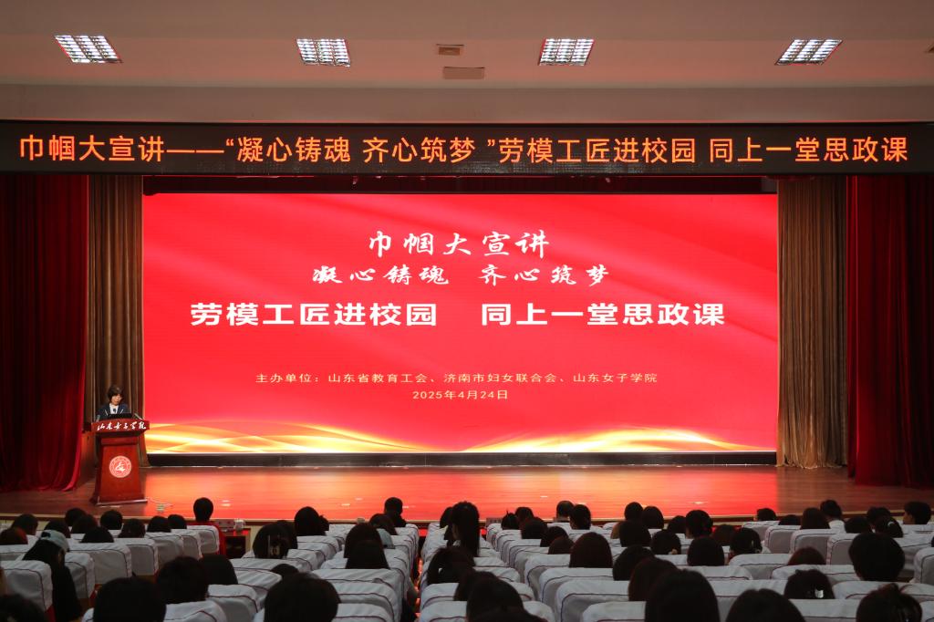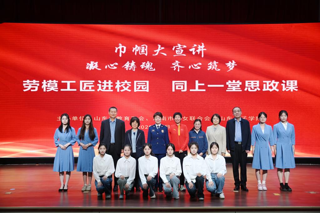 为发挥巾帼榜样示范作用,弘扬劳动精神、工匠精神。4月24日下午,学校在图书馆二楼报告厅举办“巾帼大宣讲“凝心铸魂 齐心筑梦——劳模工匠进校园 同上一堂思政课”活动。学校党委书记吕晓黎,党委委员、纪委书记、省监委驻山东女子学院监察专员杨恩红,山东省教育工会二级调研员王辉,济南市妇联宣传部部长杨小朋出席会议。学校基层党委书记、副书记,全体辅导员,马克思主义学院全体教师,教职工代表,学生代表约计400人参加活动。学校官方微信公众号同步直播。