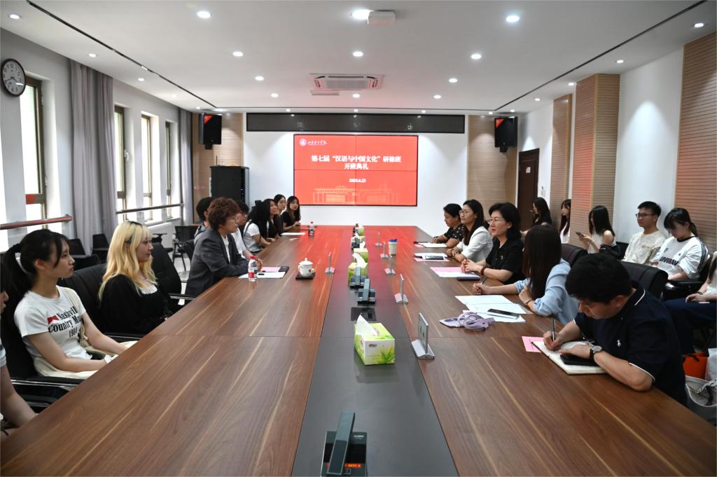 6月23日下午,学校第七届“汉语与中国文化”研修班开班式在办公楼第四会议室顺利举行。韩国韩信大学金南希教授、10名韩信大学本科生参加开班式,学校副校长刘恩允出席并致辞,国际交流合作处、继续教育学院等相关负责人参会。