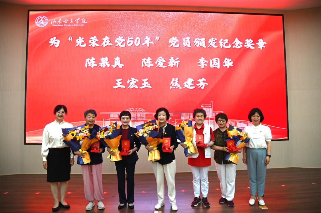 党委书记吕晓黎和校长李光红为“光荣在党50年”纪念章获得者颁发纪念章。
