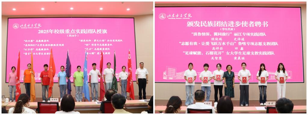 现场还为奔赴新疆、云南、甘肃少数民族聚集地区开展实践团队的学生代表颁发民族团结进步使者聘书。龙希利为16支校级重点实践团队授旗,现场掌声阵阵,气氛热烈。与会同学纷纷表示,将积极投身实践,用实际行动交出一份无愧于时代、无愧于学校的精彩答卷。