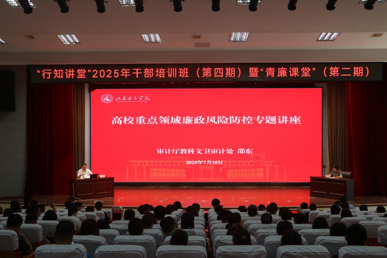 7月10日下午,学校在图书馆二楼报告厅举办“行知讲堂”2025年干部培训班 (第四期)暨“青廉课堂”(第二期),邀请山东省审计厅教科文卫处处长邵东到校围绕高校重点领域廉政风险防控做专题讲座。学校党委领导班子成员出席活动。讲座由党委委员、纪委书记,省监委派驻监察专员杨恩红主持。