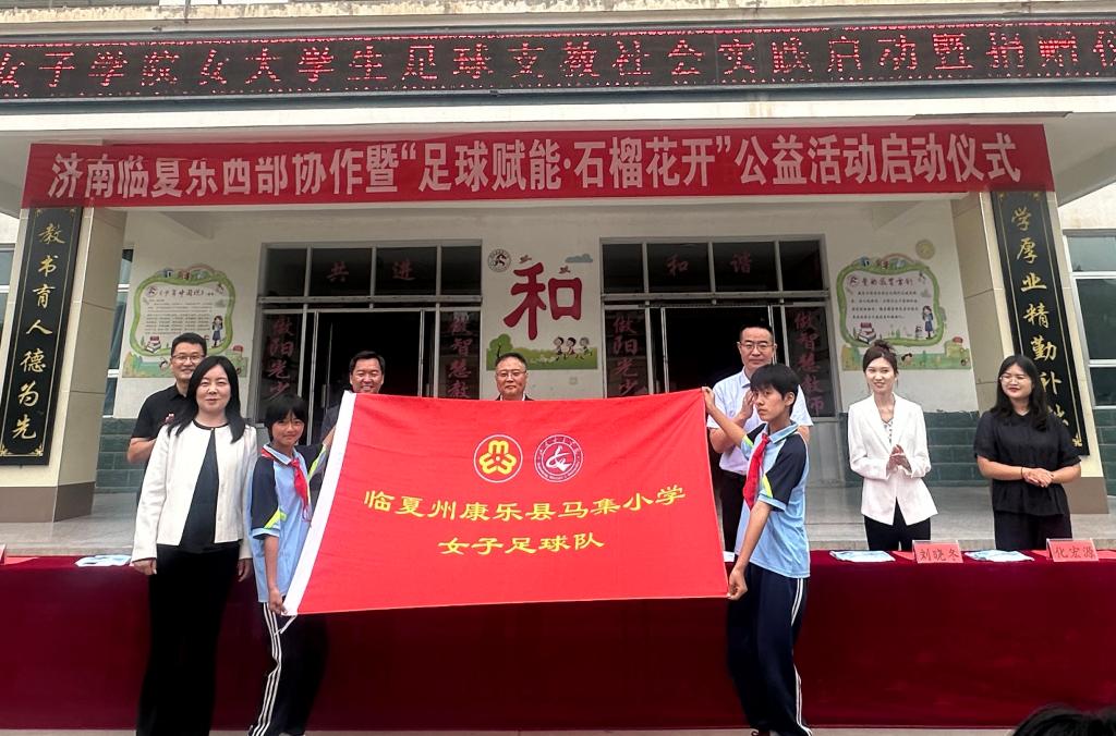 王有华向马集小学女子足球队授旗,学校联合公益组织向马集小学捐赠足球服、运动礼包以及教学物资,学校女足队长代表支教团队发言。