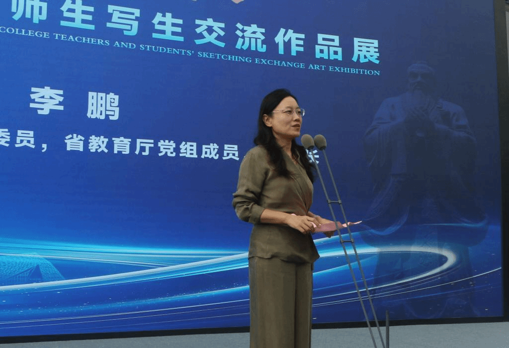 李鹏代表省教育厅发表了热情洋溢的致辞。她对“一山一水一圣人”首届鲁台高校师生写生交流作品展的成功举办表示热烈祝贺,向远道而来参与活动的两岸艺术家致以诚挚问候,对一直以来社会各界对山东教育的关心支持表示衷心感谢,并介绍了山东教育的基本情况以及近年来鲁台两地深化教育交流的做法与成效,对本次对台交流重点项目的组织实施给予充分肯定。她希望两岸高校持续拓宽交流渠道,深化合作内涵,积极为青年搭建交流互鉴和融合发展的平台,同时欢迎更多台湾同胞多来大陆、常来山东,共同在中华优秀传统文化沃土的滋养下,以艺会友、以文交心,续写“相约齐鲁、情系中华”的美好篇章。