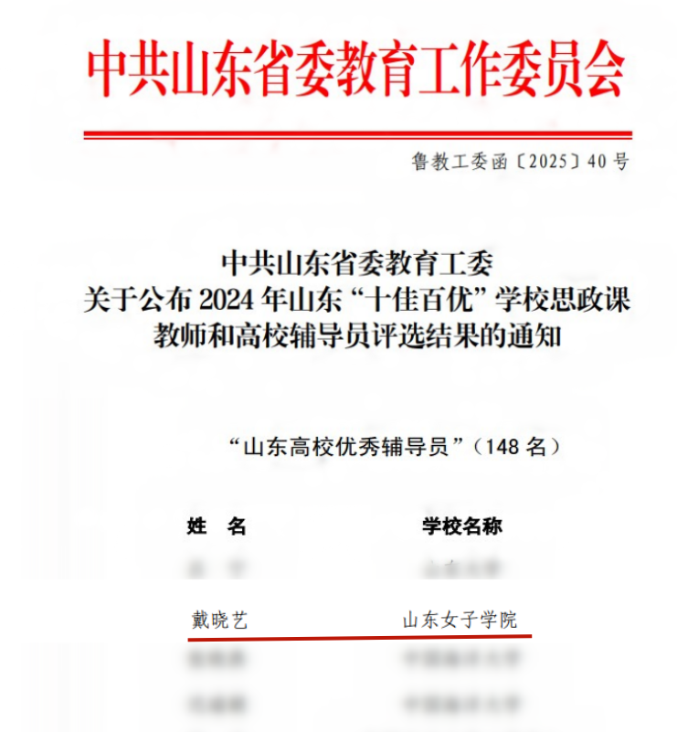 近日,中共山东省委教育工作委员会公布了2024年度山东“十佳百优”学校思政课教师和高校辅导员评选结果。学校经济学院辅导员戴晓艺获评“山东高校优秀辅导员”称号。