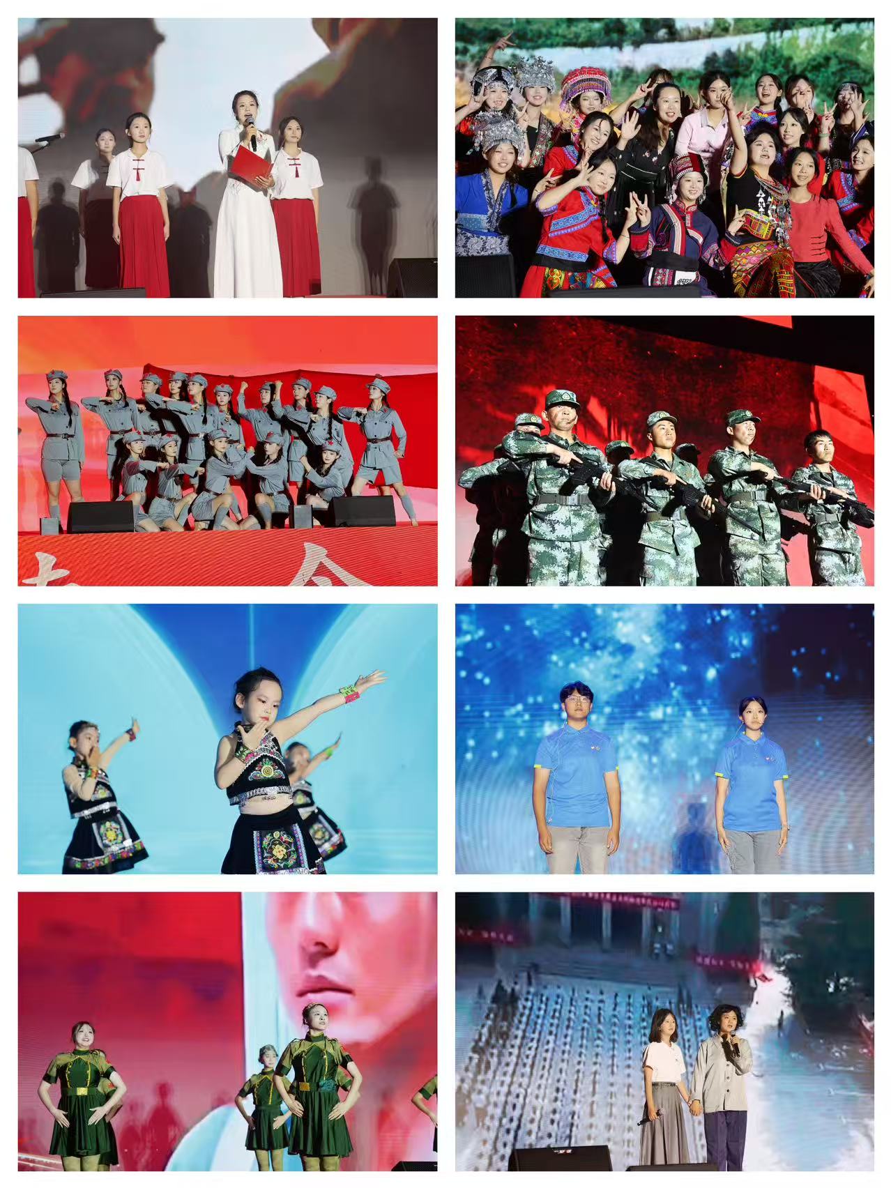 朗诵作品《山河铭记》,用朗诵的方式表达了勇担时代重任的决心;原创歌曲《军旅之光》、军体拳《舞动青春》,鼓舞士气、凝聚力量;晚会中,2025级新生辅导员和少数民族学生代表共同表演《红梅赞》,彰显女院学子的家国情怀;舞蹈《童年叮叮当》,展现了孩子们纯真、活泼的精神风貌;情景剧《青春接力微光耀疆》讲述了鲁喀支教团的实践经历,表现出女院学子为中国式现代化挺膺担当的坚定信念。