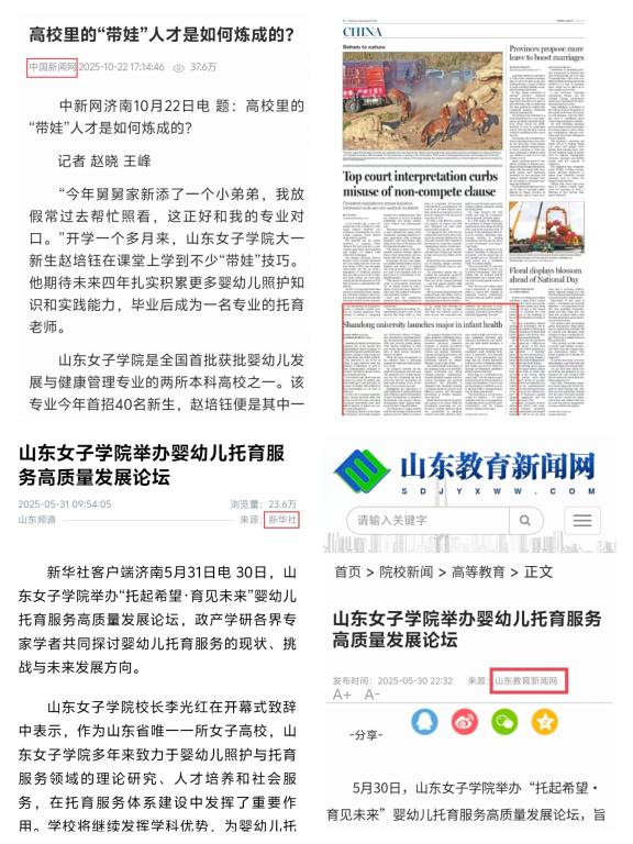 学校新增婴幼儿发展与健康管理专业,获《人民日报》海外版、央广《中国之声》、《中国日报》、《中国教育报》头版、中国新闻社和《大众日报》等媒体长篇报道。