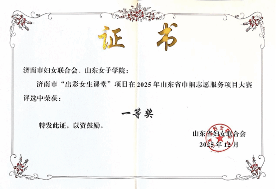近日,由山东省妇联主办的2025年山东省巾帼志愿服务项目大赛展演活动在滨州成功举办。 由济南市妇联、山东女子学院联合申报的“出彩女生课堂”项目喜获一等奖!此次大赛以“巾帼心向党 志愿绽芳华”为主题,既是以实际行动学习贯彻党的二十届四中全会精神,贯彻落实习近平总书记致中国志愿服务联合会第三届会员代表大会的重要贺信精神的生动实践,更是向第40个国际志愿者日献上的真挚礼赞。