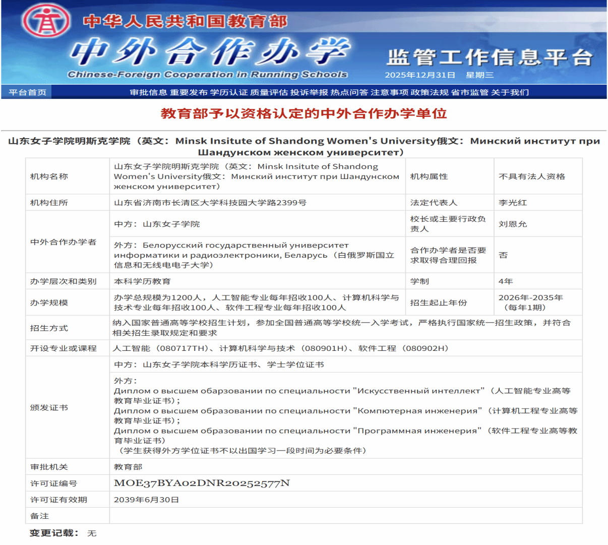 2025年12月31日,学校与白俄罗斯国立信息和无线电电子大学合作举办的非独立法人中外合作办学机构——山东女子学院明斯克学院获教育部批准正式成立。该机构是山东省首个本科层次的中白合作办学机构,采取“4+0”合作办学模式,每年招生300人,办学总规模为1200人。这一历史性突破,开启了学校高质量开放办学的崭新篇章。