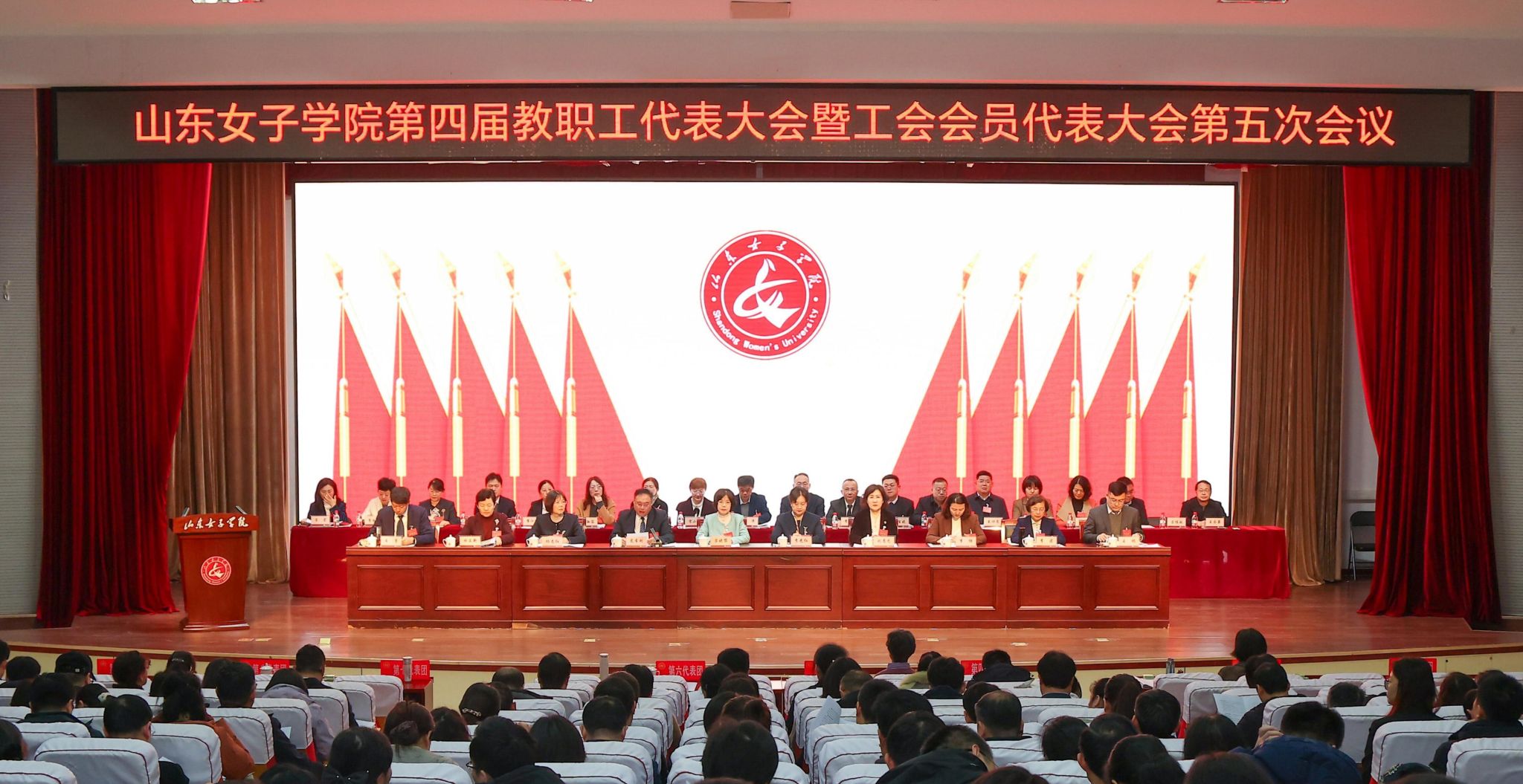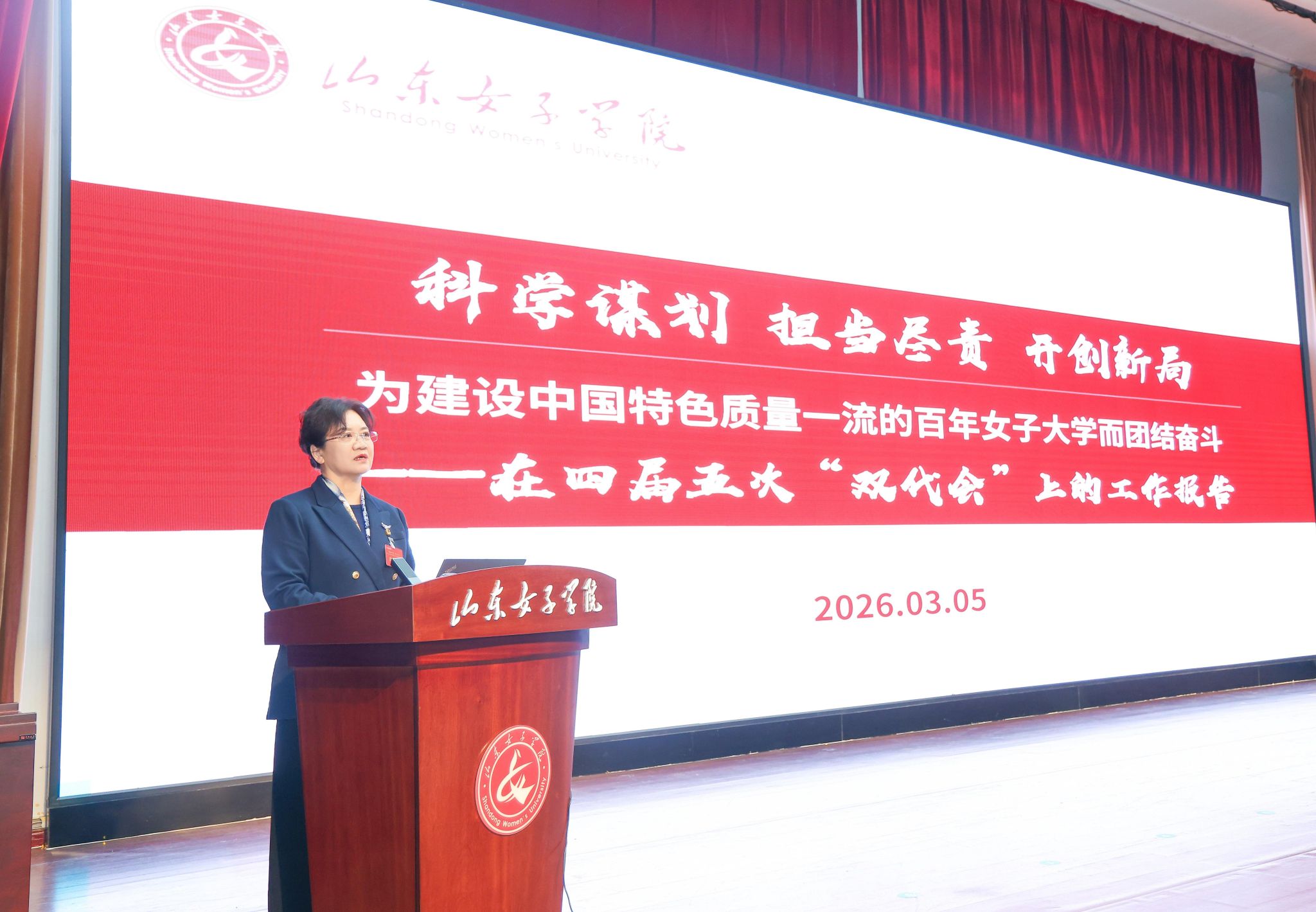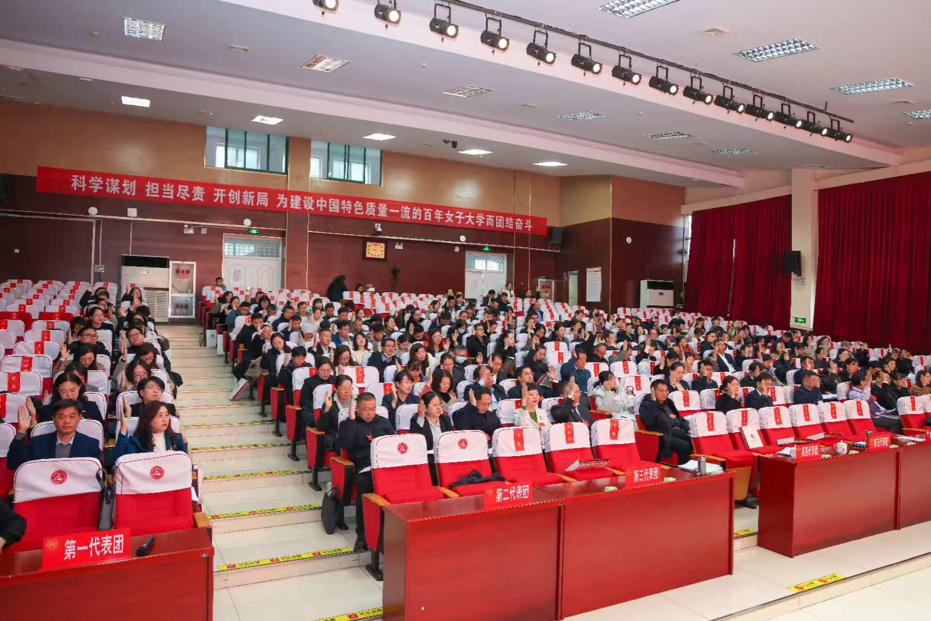大会在雄壮的国歌声中拉开帷幕。学校党委副书记、校长李光红作工作报告。报告从十个方面回顾总结了“十四五”期间取得的成绩:一是服务国家战略需求,学科专业布局不断优化;二是巩固教学中心地位,人才培养质量稳步提升;三是深化产教融合发展,科研创新能力显著增强;四是创新引育用留机制,人才队伍建设取得突破;五是拓展合作广度深度,开放办学格局基本形成;六是坚持美育浸润化人,校园文化传承创新发展;七是深化教育评价改革,内部治理体系全面优化;八是优化教育资源配置,办学基础条件提质升级;九是聚焦女性教育研究,学校发展优势持续彰显;十是坚持党的全面领导,发展保障更加坚强有力。